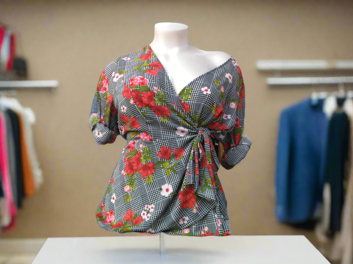 City Chic Houndstooth Floral Long Sleeve Wrap Blouse